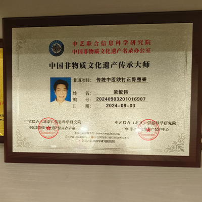 祖代相传,好学不倦,心中有乾坤,梁医师父亲也是一位跌打中医,在父亲教导下,他勤奋钻研中医跌打骨伤科,立下济世为怀心愿,并拜师精研,更有幸成为关德兴师父入室弟子。梁医师表示每日练功唱粤曲写书法,是他日常爱好,修炼功法,使他拥有强健体魄,亦可将气功中的调心、调息、调身、把道家气功运用到中医理疗中。