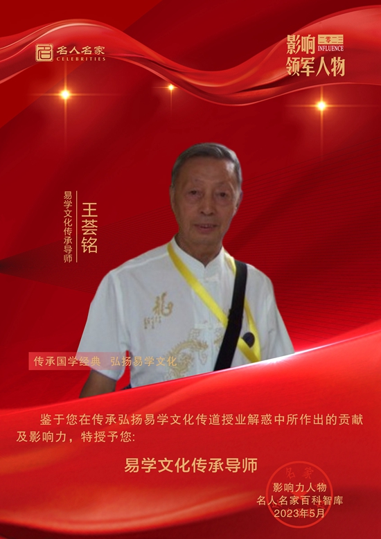 王荟铭:男,生于1942年,辽宁沈阳人,自幼酷爱易学,1962年参军,培养了坚定的正义感和坚强的意志,1967年入党,一心为党工作为人民服务。1985年到地方在企业做领导工作,身兼多职。1993年 毕业于党校高级工程师。现任:“中国国际易学联盟副主席,中华易学文化促进会副会长、职业易学家,辽宁省姓名学术会委员、常务理事,中国姓名文化研究会高 级命名策划师,国际周易应用研究院专家预测师,中国文化广播影视集团《名师讲坛》特约评委,北京建工建筑设计研究院建筑文化研究所特邀研究员,沈阳市皇姑 区天言心理咨询中心创始人”等职务。被誉为:“中国易学家,中国十大杰出命名策划师、玄空风水名师