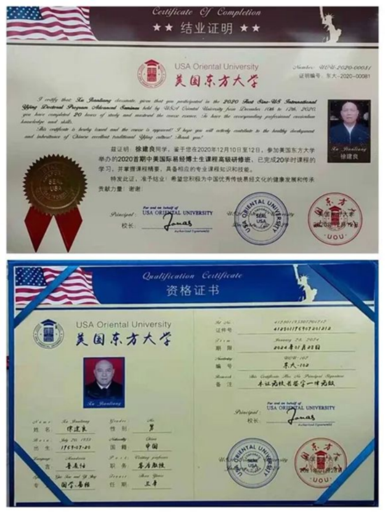 2020年在参加“首期中美国际易经博士生课程高级研修班”学习后,荣获“易经荣誉博士”称号,同年12月荣获中华风水协会颁发的“姓名学专家”荣誉证书,并加入中华风水协会成为会员专家。