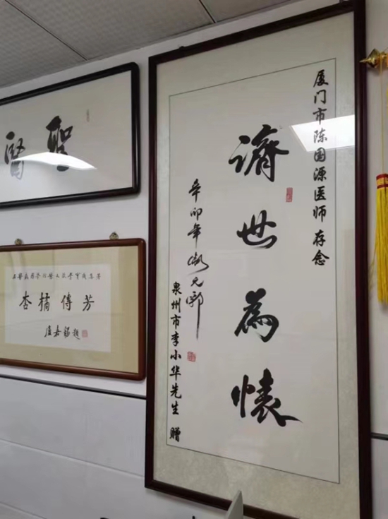 陈国源主任济世为怀,实至名归,他为解除患者痛苦,资助病人药费和治疗费用无数,送还红包难以计数,深受患者的高度赞赏。他兢兢业业,潜心耕耘,刻苦钻研,努力攻克临床难题,救治百姓疾苦,成为在军队和海内外广受爱戴和赞美的医生。在他的诊室,几乎每天都有难治性疾病药到病除的动人故事。许多患者在逼近死亡的道路上返回人生,给陈主任送来鲜花,赞扬陈国源主任“济世为怀”“聖医妙药”“大医精诚”“驱邪扶正”“医德高尚,医术精湛”“国手愈众疾,源流驱群虑;医术诚精辟,师风载青史”的牌匾和“医德双馨 情系患者”“救命之恩 终生难忘”等无数的锦旗。患者由衷的赞美心声,是对陈主任仁慈、执着、奉献的医者形象的最佳诠释!