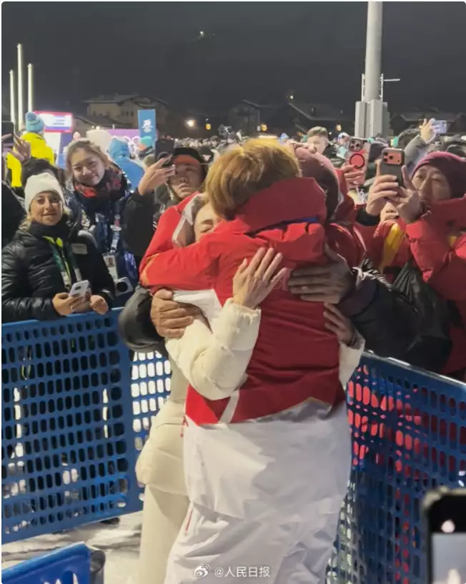 走下领奖台的苏翊鸣和父母深情相拥,泪洒赛场。